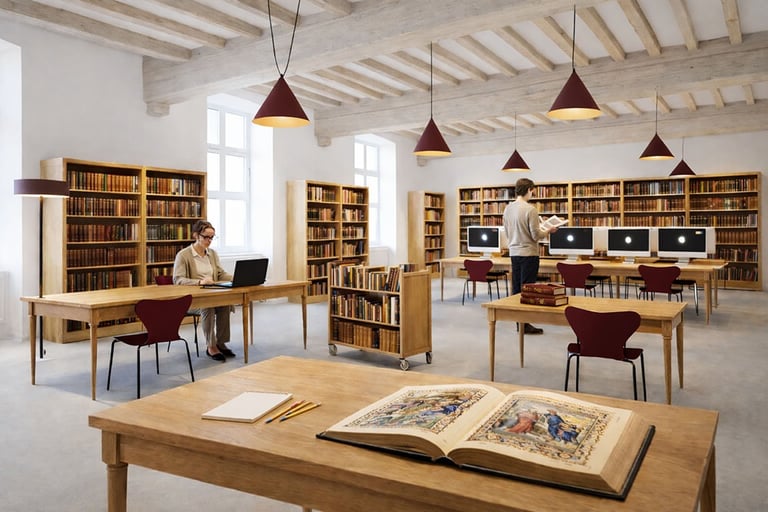 Le rez-de-chaussée est repensé pour accueillir les espaces d’exposition, ouverts et accessibles, tandis que l’étage est dédié à la consultation des fonds anciens, dans une atmosphère plus contenue et propice à l’étude.